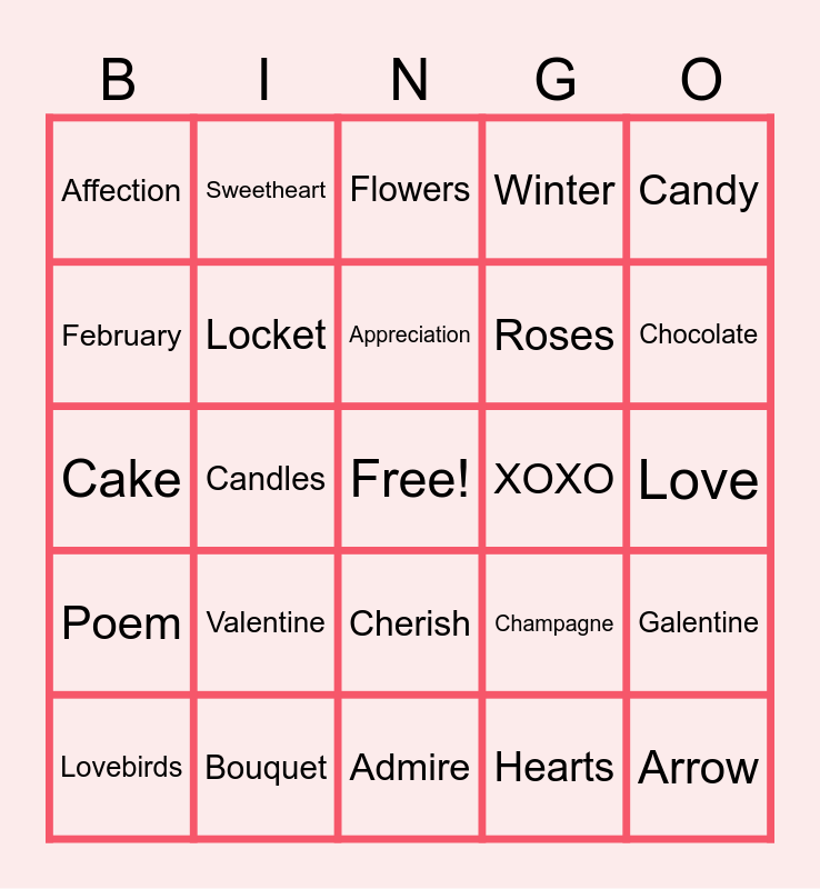 This bingo card has a free space and 42 words: Wine, Appreciation, Dinner, Valentine, Hearts, Galentine, Arrow, Cupid, Flowers, Cherish, Love, Chocolate, Candles, Candy, Caring, Champagne, Jewelry, Cake, Cookies, Sweetheart, February, Friendship, Family, Affection, Cozy, Card, Roses, Angel, Gifts, Pink, Red, Poem, Locket, Admire, Cupcake, Lovebirds, Bouquet, XOXO, Ribbon, Bow, Winter and Strawberries.