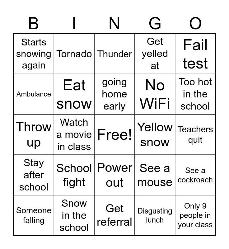 This bingo card has a free space and 24 words: School fight, Snow in the school, going home early, Someone falling, Fail test, Starts snowing again, Ambulance, Tornado, Yellow snow, Power out, No WiFi, Throw up, See a mouse, See a cockroach, Eat snow, Disgusting lunch, Teachers quit, Thunder, Too hot in the school, Watch a movie in class, Only 9 people in your class, Stay after school, Get yelled at and Get referral.