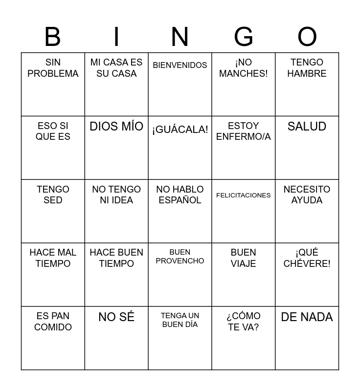 This bingo card has 30 words: NO SÉ, NO ENTIENDO, NO TENGO NI IDEA, ESTOY PERDIDO, SIN PROBLEMA, BIENVENIDOS, DIOS MÍO, BUEN PROVENCHO, FELICITACIONES, TENGA UN BUEN DÍA, NECESITO AYUDA, NO HABLO ESPAÑOL, ¿CÓMO TE VA?, DE NADA, SALUD, DIVIÉRTETE, BUEN VIAJE, HACE MAL TIEMPO, HACE BUEN TIEMPO, TENGO HAMBRE, TENGO SED, NECESITO ESTUDIAR, MI CASA ES SU CASA, ESTOY ENFERMO/A, ESO SI QUE ES, ¡NO MANCHES!, ¡QUÉ CHÉVERE!, ES PAN COMIDO, ¡GUÁCALA! and MIRA.