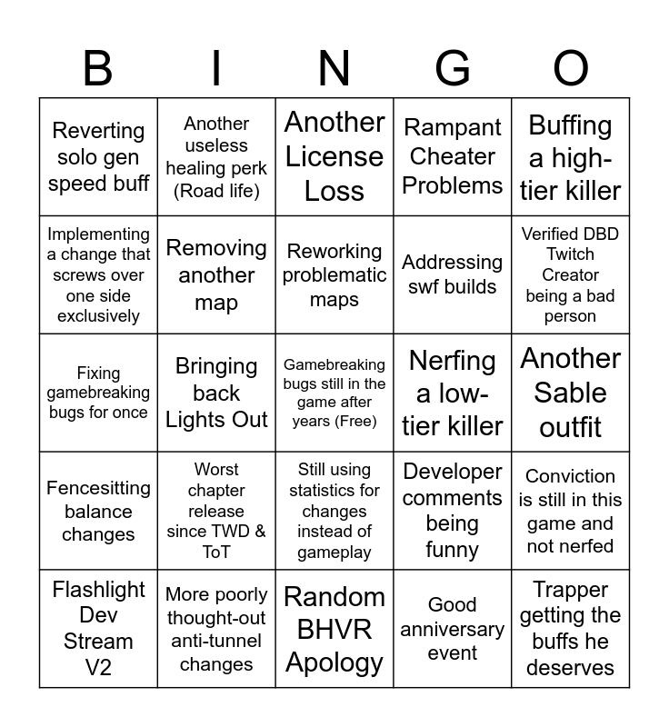 This bingo card has a free space and 24 words: Worst chapter release since TWD & ToT, More poorly thought-out anti-tunnel changes, Reworking problematic maps, Flashlight Dev Stream V2, Buffing a high-tier killer, Reverting solo gen speed buff, Implementing a change that screws over one side exclusively, Another useless healing perk (Road life), Nerfing a low-tier killer, Still using statistics for changes instead of gameplay, Addressing swf builds, Fixing gamebreaking bugs for once, Developer comments being funny, Conviction is still in this game and not nerfed, Removing another map, Good anniversary event, Another Sable outfit, Another License Loss, Verified DBD Twitch Creator being a bad person, Bringing back Lights Out, Trapper getting the buffs he deserves, Fencesitting balance changes, Rampant Cheater Problems and Random BHVR Apology.