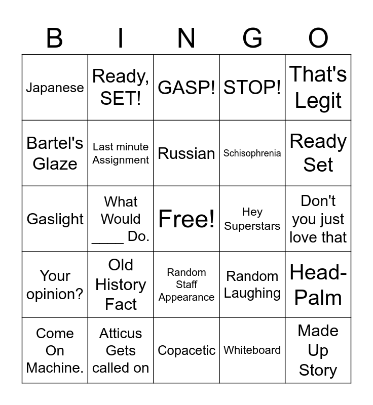 This bingo card has a free space and 29 words: Come On Machine., BAM!, What Would ____ Do., I'll Buy it, Japanese, GASP!, Last minute Assignment, Old History Fact, Hey Superstars, Atticus Gets called on, Don't you just love that, Made Up Story, Copacetic, Whiteboard, Ready Set, Random Pop/Movie Reference, Random Staff Appearance, Your opinion?, That's Legit, Gaslight, Random Laughing, Jumps On Table, Schisophrenia, Bartel's Glaze, STOP!, Ready, SET!, Head-Palm, Russian and How was your day?.