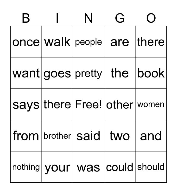 This bingo card has a free space and 24 words: nothing, brother, pretty, could, there, once, walk, people, other, women, says, goes, two, and, want, your, was, are, book, from, there, said, the and should.