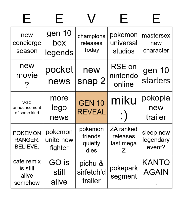 This bingo card has a free space and 24 words: cafe remix is still alive somehow, pokemon unite new fighter, new snap 2, pokepark segment, mastersex new character, new concierge season, gen 10 box legends, champions releases Today, miku :), pokopia new trailer, VGC announcement of some kind, pocket news, ZA ranked releases last mega Z, sleep new legendary event?, new movie ?, GO is still alive, pichu & sirfetch'd trailer, pokemon universal studios, gen 10 starters, POKEMON RANGER. BELIEVE., more lego news, pokemon friends quietly dies, RSE on nintendo online and KANTO AGAIN ..