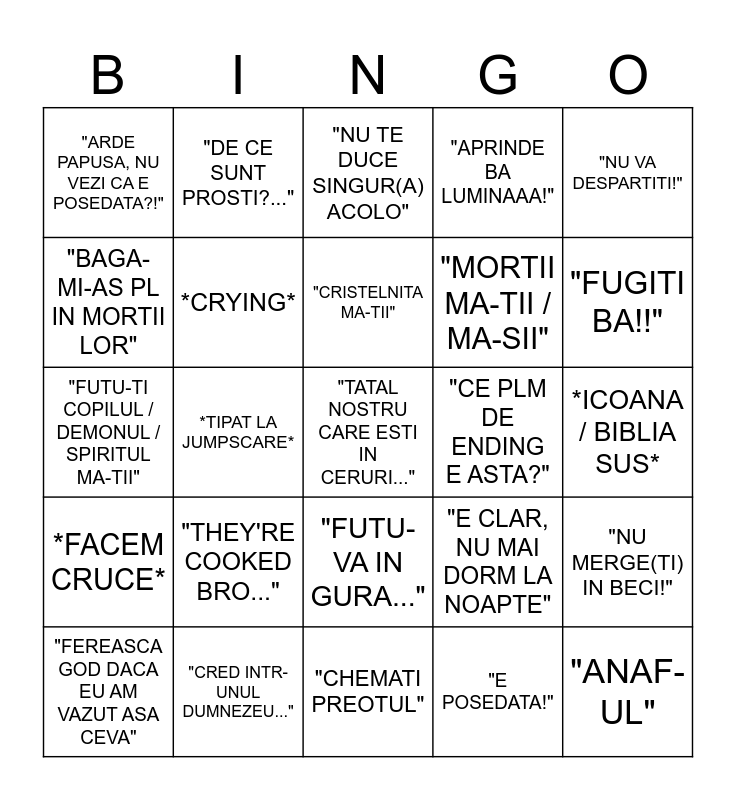 This bingo card has 25 words: "THEY'RE COOKED BRO...", "CHEMATI PREOTUL", "CRISTELNITA MA-TII", "FEREASCA GOD DACA EU AM VAZUT ASA CEVA", "NU VA DESPARTITI!", "ARDE PAPUSA, NU VEZI CA E POSEDATA?!", "BAGA-MI-AS PL IN MORTII LOR", "DE CE SUNT PROSTI?...", "CE PLM DE ENDING E ASTA?", "FUTU-VA IN GURA...", "MORTII MA-TII / MA-SII", "FUTU-TI COPILUL / DEMONUL / SPIRITUL MA-TII", "E CLAR, NU MAI DORM LA NOAPTE", "NU MERGE(TI) IN BECI!", *CRYING*, "ANAF-UL", *ICOANA / BIBLIA SUS*, "NU TE DUCE SINGUR(A) ACOLO", "FUGITI BA!!", *TIPAT LA JUMPSCARE*, "TATAL NOSTRU CARE ESTI IN CERURI...", "CRED INTR-UNUL DUMNEZEU...", *FACEM CRUCE*, "APRINDE BA LUMINAAA!" and "E POSEDATA!".