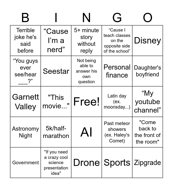 This bingo card has a free space and 29 words: Government, His car/how cars work, "This movie...", His kids, Terrible joke he's said before, 5+ minute story without reply, Seestar, 5k/half-marathon, Latin day (ex. moonsday...), "If you need a crazy cool science presentation idea", “My youtube channel”, Zipgrade, Drone, Sports, Daughter's boyfriend, Flat Earth, AI, Astronomy Night, Disney, Garnett Valley, Past meteor showers (ex. Haley's Comet), 5+ bathroom breaks for students, Personal finance, “You guys ever see/hear ___?”, “Cause I teach classes on the opposite side of the school”, “Cause I’m a nerd”, "Come back to the front of the room", Not being able to answer his own question and Star sign/Astrology.