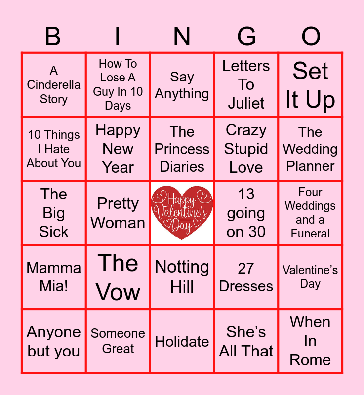 This bingo card has a free space and 52 words: Bridget Jones Diary, When In Rome, Something Borrowed, Holidate, The Vow, The Holiday, How To Lose A Guy In 10 Days, Ella Enchanted, 10 Things I Hate About You, To All The Boys I’ve Loved Before, Happy New Year, Love Simon, Valentine’s Day, 27 Dresses, She’s The Man, The Proposal, The Princess Diaries, 13 going on 30, When Harry Met Sally, Set It Up, Pretty Woman, She’s All That, A Cinderella Story, Crazy Stupid Love, 50 First Dates, Crazy Rich Asians, Titanic, The Fault In Our Stars, The Wedding Planner, Stuck In Love, The Last Song, Letters To Juliet, He’s Just Not That Into You, Sleepless in Seattle, 500 Days of Summer, Say Anything, Someone Great, Silver Lining’s Playbook, The Princess Bride, Breakfast at Tiffany’s, Sweet Home Alabama, Four Weddings and a Funeral, Mamma Mia!, Forgetting Sarah Marshall, Notting Hill, You’ve Got Mail, Love Actually, The Big Sick, Definitely, Maybe, My Big Fat Greek Wedding, Anyone but you and Hitch.