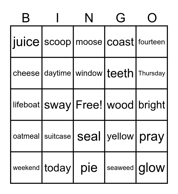 This bingo card has a free space and 34 words: football, seaweed, sunlight, grapefruit, oatmeal, daytime, fourteen, weekend, scoop, cartoon, window, moose, lunchroom, notebook, wood, Thursday, today, lifeboat, suitcase, yellow, seal, glue, juice, bright, pie, glow, coast, cheap, teeth, cheese, paint, sway, pray and foam.