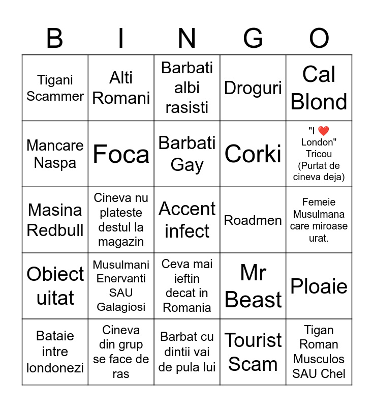 This bingo card has 25 words: Musulmani Enervanti SAU Galagiosi, Barbat cu dintii vai de pula lui, Barbati Gay, Bataie intre londonezi, Cal Blond, Tigani Scammer, Mancare Naspa, Alti Romani, Roadmen, Ceva mai ieftin decat in Romania, Corki, Masina Redbull, Mr Beast, Ploaie, Foca, Tigan Roman Musculos SAU Chel, Femeie Musulmana care miroase urat., Barbati albi rasisti, "I ❤️ London" Tricou (Purtat de cineva deja), Cineva nu plateste destul la magazin, Accent infect, Cineva din grup se face de ras, Obiect uitat, Droguri and Tourist Scam.