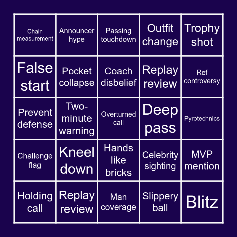 This bingo card has 83 words: Free!, Rushing touchdown, Passing touchdown, Goal-line stand, Third down stop, Fourth down try, Turnover, Interception, Pick six, Fumble, Fumble recovery, Quarterback hit, Pocket collapse, Deep pass, Stuffed run, Chain measurement, Holding call, False start, Defensive pass interference, Offensive pass interference, Challenge play, Replay review, Overturned call, Clock running, Two-minute warning, Missed field goal, Blocked kick, Punt, Kick return, Long return, Kneel down, Spike ball, Hurry-up offense, Prevent defense, Blitz, Zone coverage, Man coverage, Touchdown dance, Ref controversy, Challenge flag, Interception, Fumble, Holding call, Coach yelling, Crowd goes wild, Crowd booing, Announcer hype, “This is huge”, Close-up fan, Crying fan, Celebrity sighting, Outfit change, Pyrotechnics, Wardrobe malfunction, Lip-sync debate, Surprise guest, Talking animal ad, Celebrity commercial, Replay review, Overturned call, Clock stops, Blowout game, Comeback attempt, Trophy shot, Confetti drop, MVP mention, Super Bowl ring, Next year talk, Slipped turf, Panic throw, “Just chuck it”, Wide-open miss, Butterfingers, Hands like bricks, Slippery ball, Ran into teammate, Toe barely in, Coach disbelief, Player arguing, Run on third-and-long, Defender celebrates early, Slide too late and Everyone confused.