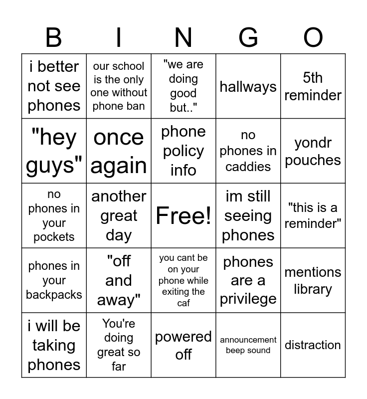 This bingo card has a free space and 24 words: "off and away", You're doing great so far, phone policy info, i will be taking phones, 5th reminder, i better not see phones, "hey guys", our school is the only one without phone ban, im still seeing phones, you cant be on your phone while exiting the caf, no phones in caddies, no phones in your pockets, phones are a privilege, mentions library, once again, announcement beep sound, "this is a reminder", "we are doing good but..", yondr pouches, another great day, distraction, phones in your backpacks, hallways and powered off.