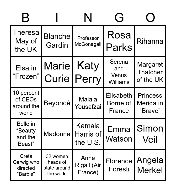 This bingo card has 37 words: Free!, Josephine Baker, Simon Veil, Marie Curie, Simon Veil, Madonna, Katy Perry, Britney Spears, Rihanna, Shakira, Beyoncé, Rosa Parks, Malala Yousafzai, Princess Merida in “Brave”, Elsa in “Frozen”, Belle in “Beauty and the Beast”, Hermione Granger, Professor McGonagall, Kamala Harris of the U.S., Élisabeth Borne of France, Theresa May of the UK, Margaret Thatcher of the UK, Greta Gerwig who directed “Barbie”, Anne Rigail (Air France), Indra Nooyi (Pepsi), Florence Foresti, Blanche Gardin, Katherine Goble Johnson, Dorothy Vaughan, Mary Jackson, Six women are buried here in Paris, 32 women heads of state around the world, 10 percent of CEOs around the world, Angela Merkel, Emma Watson, Serena and Venus Williams and Michelle Obama.
