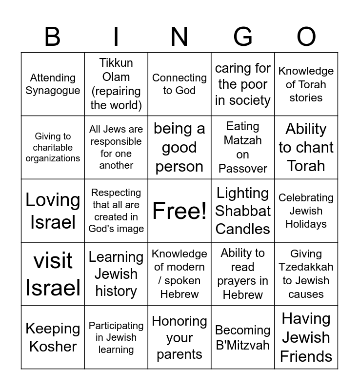 This bingo card has a free space and 29 words: Keeping Kosher, Belief in God, Respecting that all are created in God's image, Belonging to a synagogue, Attending Synagogue, Connecting to God, All Jews are responsible for one another, Learning Jewish history, Lighting Shabbat Candles, Participating in Jewish learning, Celebrating Jewish Holidays, Having Jewish Friends, Honoring your parents, Becoming B'Mitzvah, Ability to chant Torah, Praying, Knowledge of modern / spoken Hebrew, visit Israel, Knowledge of Torah stories, Loving Israel, Ability to read prayers in Hebrew, Wearing Jewish symbols, Eating Matzah on Passover, Giving to charitable organizations, caring for the poor in society, Tikkun Olam (repairing the world), Giving Tzedakkah to Jewish causes, being a good person and caring for the earth.