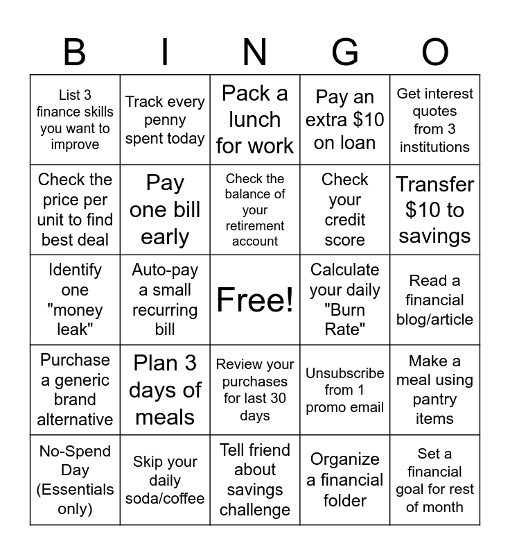 This bingo card has a free space and 24 words: Plan 3 days of meals, Skip your daily soda/coffee, Check the balance of your retirement account, No-Spend Day (Essentials only), Get interest quotes from 3 institutions, List 3 finance skills you want to improve, Check the price per unit to find best deal, Track every penny spent today, Calculate your daily "Burn Rate", Review your purchases for last 30 days, Check your credit score, Identify one "money leak", Unsubscribe from 1 promo email, Make a meal using pantry items, Pay one bill early, Organize a financial folder, Read a financial blog/article, Pack a lunch for work, Transfer $10 to savings, Auto-pay a small recurring bill, Set a financial goal for rest of month, Purchase a generic brand alternative, Pay an extra $10 on loan and Tell friend about savings challenge.