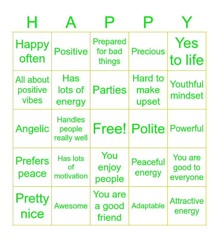 This bingo card has a free space and 24 words: Has lots of motivation, Awesome, Parties, Pretty nice, Yes to life, Happy often, All about positive vibes, Positive, Polite, You enjoy people, Hard to make upset, Angelic, Peaceful energy, You are good to everyone, Has lots of energy, Adaptable, Powerful, Prepared for bad things, Youthful mindset, Handles people really well, Attractive energy, Prefers peace, Precious and You are a good friend.