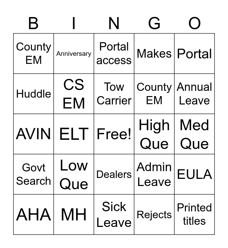 This bingo card has a free space and 40 words: Junks, AVIN, Bond, CS EM, MH, Dealers, Tow Carrier, LEA, Portal, Govt Search, ELT, Makes, Printed titles, Med Que, High Que, Low Que, Nationals, County EM, Fleets, Portal access, EULA, Rejects, County EM, Huddle, Traveling Trophy, Birthdays, Howard, Badges, DMV, EEC, Culture Committee, AHA, High Five, Admin Leave, Annual Leave, Sick Leave, FMLA, Retirement, Anniversary and Never ending fun.