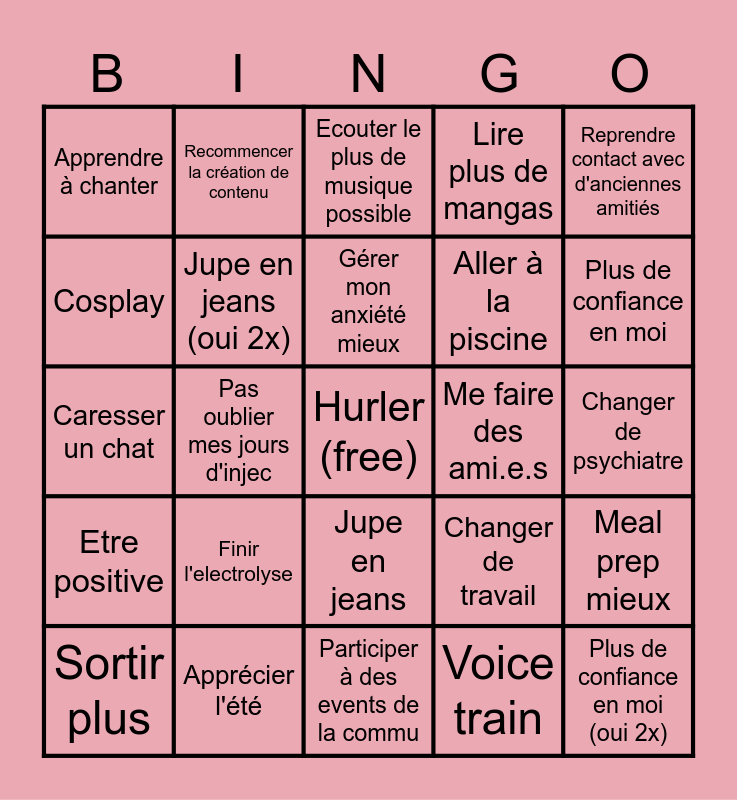 This bingo card has a free space and 24 words: Finir l'electrolyse, Apprécier l'été, Gérer mon anxiété mieux, Sortir plus, Reprendre contact avec d'anciennes amitiés, Apprendre à chanter, Cosplay, Recommencer la création de contenu, Me faire des ami.e.s, Jupe en jeans, Aller à la piscine, Caresser un chat, Changer de travail, Meal prep mieux, Jupe en jeans (oui 2x), Voice train, Changer de psychiatre, Ecouter le plus de musique possible, Plus de confiance en moi, Pas oublier mes jours d'injec, Plus de confiance en moi (oui 2x), Etre positive, Lire plus de mangas and Participer à des events de la commu.