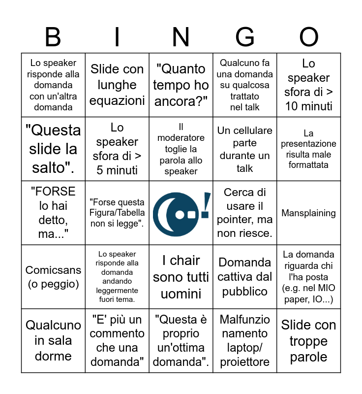 This bingo card has a free space and 24 words: Lo speaker risponde alla domanda andando leggermente fuori tema., "E' più un commento che una domanda", Il moderatore toglie la parola allo speaker, Qualcuno in sala dorme, Lo speaker sfora di > 10 minuti, Lo speaker risponde alla domanda con un'altra domanda, "Questa slide la salto"., Slide con lunghe equazioni, Cerca di usare il pointer, ma non riesce., I chair sono tutti uomini, Un cellulare parte durante un talk, "FORSE lo hai detto, ma...", Domanda cattiva dal pubblico, La domanda riguarda chi l'ha posta (e.g. nel MIO paper, IO...), Lo speaker sfora di > 5 minuti, Malfunzio namento laptop/ proiettore, Mansplaining, "Quanto tempo ho ancora?", La presentazione risulta male formattata, "Forse questa Figura/Tabella non si legge"., Slide con troppe parole, Comicsans (o peggio), Qualcuno fa una domanda su qualcosa trattato nel talk and "Questa è proprio un'ottima domanda"..