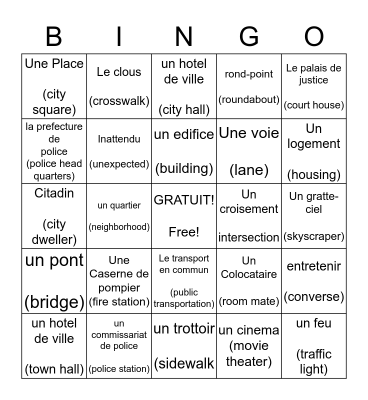 This bingo card has a free space and 24 words: Une Caserne de pompier (fire station), un commissariat de police (police station), un edifice (building), un hotel de ville (town hall), Le palais de justice (court house), Une Place (city square), la prefecture de police (police head quarters), Le clous (crosswalk), Un croisement intersection, Le transport en commun (public transportation), Une voie (lane), Citadin (city dweller), Un Colocataire (room mate), entretenir (converse), Inattendu (unexpected), un cinema (movie theater), Un gratte-ciel (skyscraper), un hotel de ville (city hall), Un logement (housing), un quartier (neighborhood), un feu (traffic light), un pont (bridge), rond-point (roundabout) and un trottoir (sidewalk.