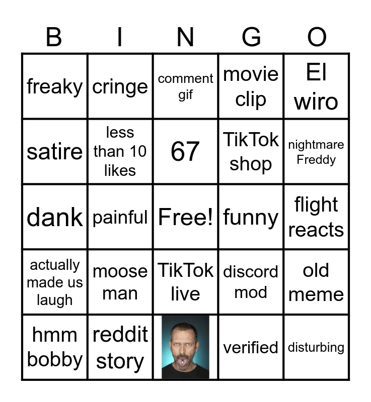 This bingo card has 1 images, a free space and 23 words: moose man, reddit story, 67, hmm bobby, El wiro, freaky, satire, cringe, funny, TikTok live, TikTok shop, dank, discord mod, old meme, less than 10 likes, verified, flight reacts, comment gif, nightmare Freddy, painful, disturbing, actually made us laugh and movie clip.
