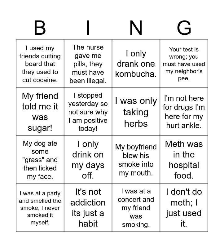 This bingo card has 16 words: It's not addiction its just a habit, Meth was in the hospital food., I only drank one kombucha., I used my friends cutting board that they used to cut cocaine., My dog ate some "grass" and then licked my face., The nurse gave me pills, they must have been illegal., My boyfriend blew his smoke into my mouth., I was at a concert and my friend was smoking., My friend told me it was sugar!, I stopped yesterday so not sure why I am positive today!, I was at a party and smelled the smoke, I never smoked it myself., Your test is wrong; you must have used my neighbor's pee., I only drink on my days off., I'm not here for drugs I'm here for my hurt ankle., I was only taking herbs and I don't do meth; I just used it..