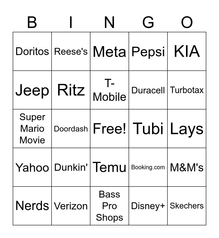 This bingo card has a free space and 29 words: Nerds, Lilo & Stitch, Doordash, Paramount+, Doritos, Meta, Ritz, Dunkin', Tubi, Verizon, Lays, Skechers, Bass Pro Shops, Disney+, Turbotax, Pizza Rolls, Temu, Yahoo, KIA, Super Mario Movie, Booking.com, Pringles, Duracell, Jeep, Pepsi, Reese's, M&M's, T-Mobile and Hellmann's Mayo.
