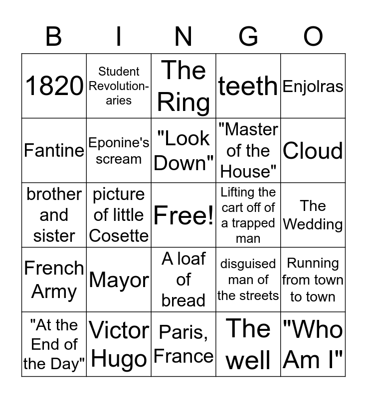 This bingo card has a free space and 24 words: Mayor, Victor Hugo, "Look Down", "At the End of the Day", Enjolras, 1820, Fantine, Student Revolution-aries, Lifting the cart off of a trapped man, A loaf of bread, "Master of the House", brother and sister, disguised man of the streets, Running from town to town, Eponine's scream, The well, The Wedding, The Ring, Cloud, picture of little Cosette, "Who Am I", French Army, teeth and Paris, France.
