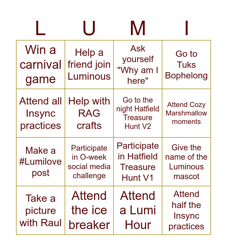This bingo card has 16 words: Attend the ice breaker, Give the name of the Luminous mascot, Ask yourself "Why am I here", Win a carnival game, Make a #Lumilove post, Help a friend join Luminous, Participate in Hatfield Treasure Hunt V1, Attend a Lumi Hour, Attend all Insync practices, Help with RAG crafts, Take a picture with Raul, Go to Tuks Bophelong, Participate in O-week social media challenge, Attend Cozy Marshmallow moments, Go to the night Hatfield Treasure Hunt V2 and Attend half the Insync practices.