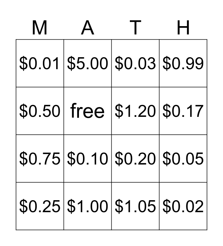 This bingo card has 16 words: $0.25, $1.00, $0.03, $0.99, $0.50, $5.00, $0.20, $0.05, $0.01, free, $1.05, $0.17, $0.75, $0.10, $1.20 and $0.02.