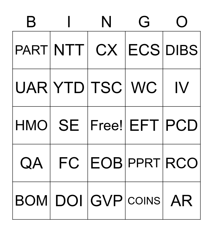 This bingo card has a free space and 44 words: ADJ, AR, AUTH, BOM, CIF, COINS, CX, DED, DIBS, DOI, ECS, EFT, EOB, FC, FO, GVP, HIPAA, HMO, INS, IV, NTT, OON, OWS, PART, PAS, PCD, PCP, PPP, PPRT, QA, RCM, RCO, RCR, RX, SE, SEPT, SVP, TRG, TSC, UAR, WC, YOY, YTD and ZBA.