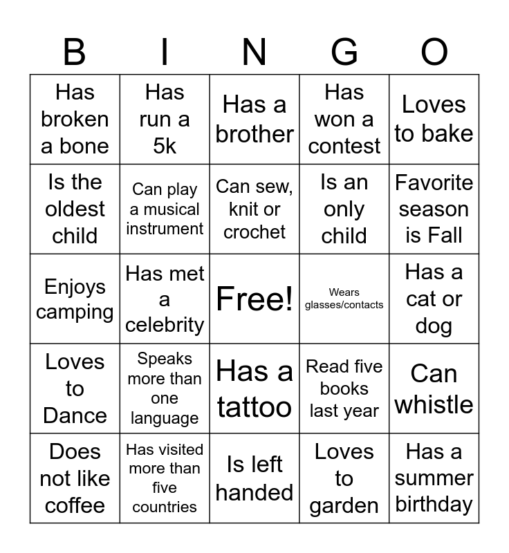 This bingo card has a free space and 24 words: Speaks more than one language, Has visited more than five countries, Can sew, knit or crochet, Does not like coffee, Loves to bake, Has broken a bone, Is the oldest child, Has run a 5k, Wears glasses/contacts, Has a tattoo, Is an only child, Enjoys camping, Read five books last year, Can whistle, Can play a musical instrument, Loves to garden, Has a cat or dog, Has a brother, Favorite season is Fall, Has met a celebrity, Has a summer birthday, Loves to Dance, Has won a contest and Is left handed.