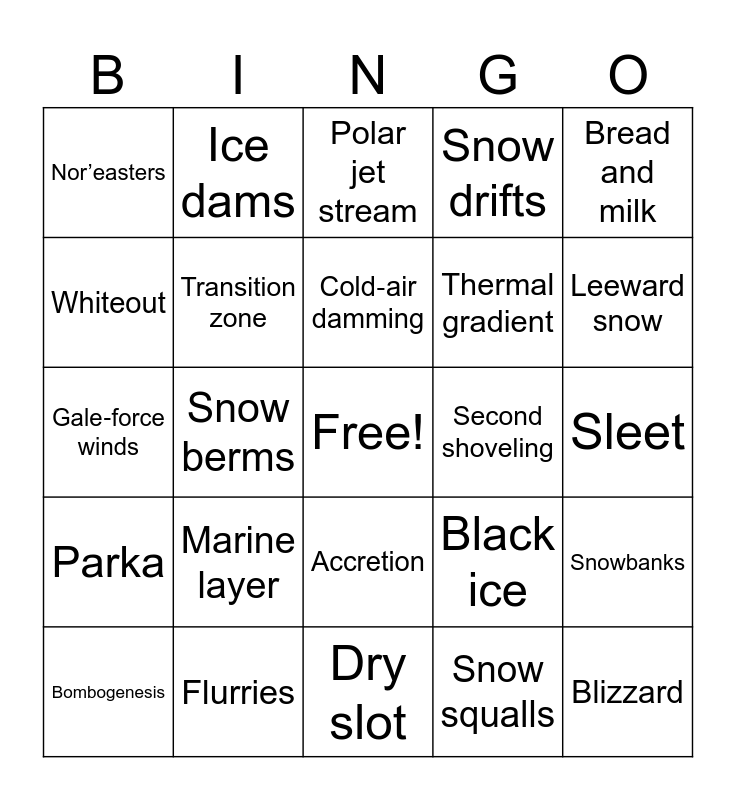 This bingo card has a free space and 28 words: Snowbanks, Snowfall band, Thermal gradient, Snow squalls, Whiteout, Polar jet stream, Ice dams, Parka, Second shoveling, Bombogenesis, Gale‑force winds, Snow drifts, Flurries, Dry slot, Leeward snow, Stratiform snow, Marine layer, Transition zone, Cold‑air damming, Accretion, Nor’easters, Heart‑attack snow, Blizzard, Snow berms, Sleet, Black ice, Bread and milk and Nemo.