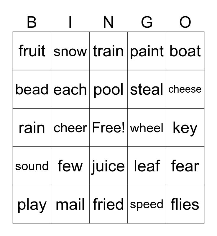 This bingo card has a free space and 34 words: trail, speed, steal, meat, sound, each, boat, play, snow, tree, pool, train, claw, soup, wheel, cheese, mail, rain, few, leaf, juice, clue, fruit, key, fried, flies, paint, teach, steal, bead, beach, cheer, fear and steer.
