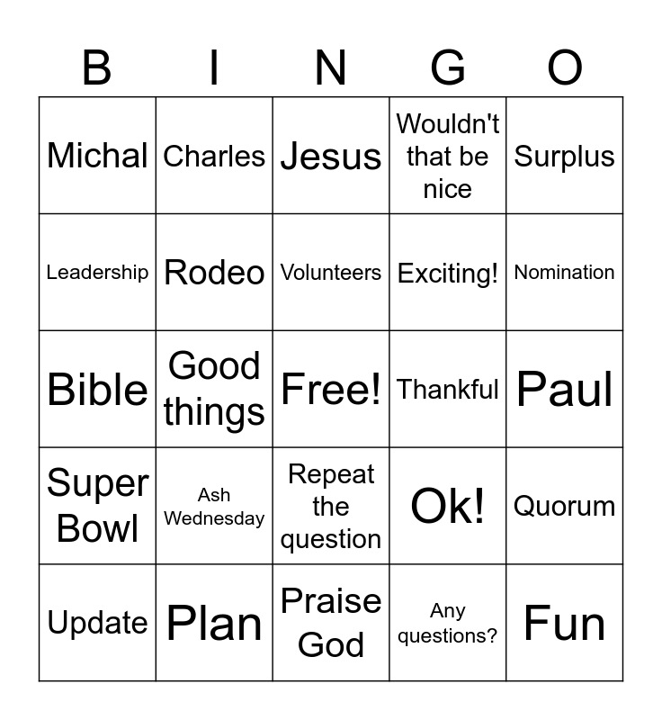 This bingo card has a free space and 43 words: Let's Pray, Fun, Discipleship, Update, Save the date, Any questions?, Jesus, Strategic, Surplus, Plan, Wouldn't that be nice, Thankful, Repeat the question, Ash Wednesday, Amen, Praise God, Budget, Bible, Business, Nomination, Charles, Matt, Jeff, Michal, Easton, Paul, Women, Philosophy, Ok!, Super Bowl, Building, Quorum, Count, Good things, Space, Ministry, Staff, Volunteers, Leadership, Exciting!, Dinner, Rodeo and Cold.