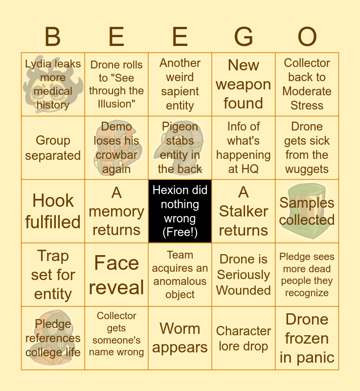 This bingo card has 5 images, a free space and 24 words: Face reveal, Collector gets someone's name wrong, Pigeon stabs entity in the back, Pledge references college life, Collector back to Moderate Stress, Lydia leaks more medical history, Group separated, Drone rolls to "See through the Illusion", A Stalker returns, Team acquires an anomalous object, Info of what's happening at HQ, Hook fulfilled, Drone is Seriously Wounded, Pledge sees more dead people they recognize, Demo loses his crowbar again, Character lore drop, Samples collected, Another weird sapient entity, Drone gets sick from the wuggets, A memory returns, Drone frozen in panic, Trap set for entity, New weapon found and Worm appears.