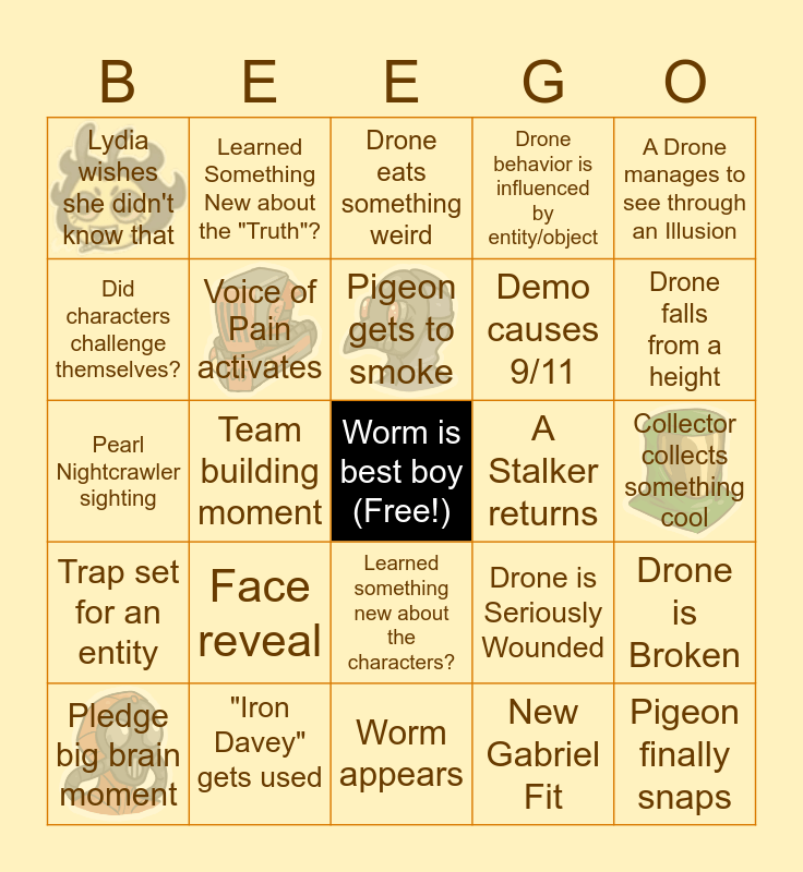This bingo card has 5 images, a free space and 24 words: Face reveal, "Iron Davey" gets used, Pigeon gets to smoke, Pledge big brain moment, A Drone manages to see through an Illusion, Lydia wishes she didn't know that, Did characters challenge themselves?, Learned Something New about the "Truth"?, A Stalker returns, Learned something new about the characters?, Demo causes 9/11, Pearl Nightcrawler sighting, Drone is Seriously Wounded, Drone is Broken, Voice of Pain activates, New Gabriel Fit, Collector collects something cool, Drone eats something weird, Drone falls from a height, Team building moment, Pigeon finally snaps, Trap set for an entity, Drone behavior is influenced by entity/object and Worm appears.