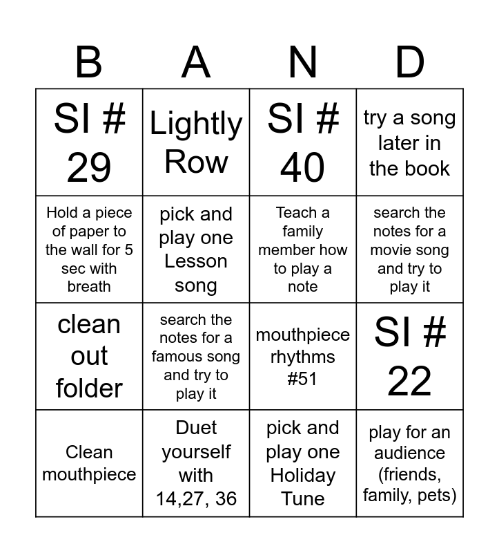 This bingo card has 16 words: Duet yourself with 14,27, 36, SI # 22, SI # 40, SI # 29, clean out folder, Lightly Row, mouthpiece rhythms #51, pick and play one Holiday Tune, Hold a piece of paper to the wall for 5 sec with breath, pick and play one Lesson song, Clean mouthpiece, try a song later in the book, search the notes for a famous song and try to play it, search the notes for a movie song and try to play it, Teach a family member how to play a note and play for an audience (friends, family, pets).