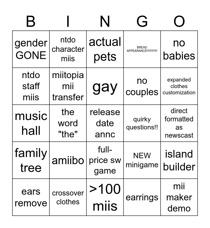 This bingo card has a free space and 24 words: amiibo, crossover clothes, gay, ears remove, no babies, gender GONE, ntdo staff miis, ntdo character miis, quirky questions!!, full-price sw game, no couples, music hall, NEW minigame, island builder, miitopia mii transfer, earrings, direct formatted as newscast, actual pets, expanded clothes customization, the word "the", mii maker demo, family tree, BREAD APPEARANCE!!!!!!!!!!!!! and >100 miis.