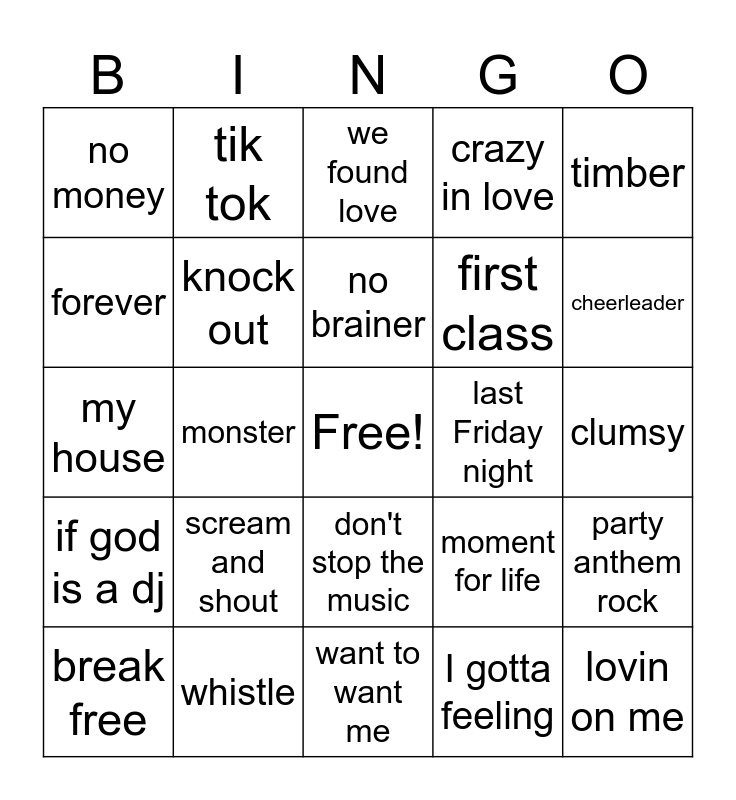 This bingo card has a free space and 44 words: magic, lovin on me, lush life, break free, it aint me, I gotta feeling, we found love, starships, timber, whistle, crazy in love, last Friday night, don't stop the music, scream and shout, cant hold us, want to want me, umbrella, my house, stronger, cheerleader, tik tok, toxic, dynamite, no money, the thrill, clumsy, body like a back road, I cry, moment for life, if god is a dj, I know what you did last summer, party anthem rock, girls like you, play that song, monster, I spy, dancing in the moonlight, goodbye earl, no brainer, forever, first class, baby, knock out and paper planes.