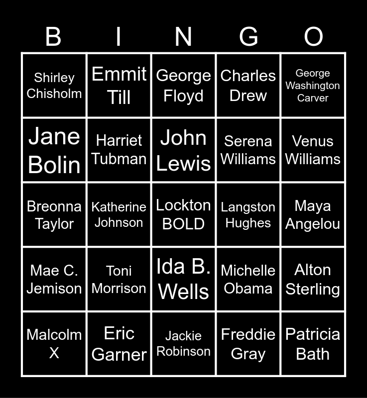 This bingo card has a free space and 39 words: Mike Brown Jr., Martin Luther King Jr., Rosa Parks, Harriet Tubman, Malcolm X, Ida B. Wells, John Lewis, Ella Baker, George Washington Carver, Mae C. Jemison, Katherine Johnson, Charles Drew, Patricia Bath, Maya Angelou, Langston Hughes, Toni Morrison, Aretha Franklin, Shirley Chisholm, Barack Obama, Michelle Obama, Jane Bolin, Jackie Robinson, Serena Williams, Venus Williams, Jesse Owens, Willie Rudolph, Madam C.J. Walker, Bessie Coleman, Alvin Ailey Jr., Emmit Till, Ruby Bridges, Henrietta Lacks, George Floyd, Eric Garner, Freddie Gray, Philando Castile, Alton Sterling, Breonna Taylor and Sandra Bland.