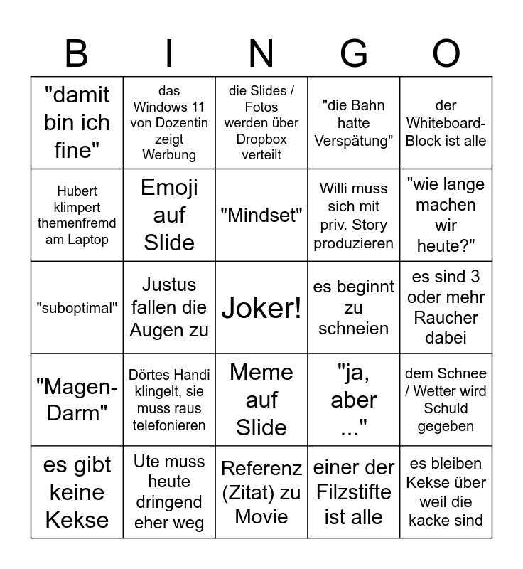 This bingo card has a free space and 24 words: Dörtes Handi klingelt, sie muss raus telefonieren, Ute muss heute dringend eher weg, "Mindset", es gibt keine Kekse, der Whiteboard-Block ist alle, "damit bin ich fine", Hubert klimpert themenfremd am Laptop, das Windows 11 von Dozentin zeigt Werbung, es beginnt zu schneien, Meme auf Slide, Willi muss sich mit priv. Story produzieren, "suboptimal", "ja, aber ...", dem Schnee / Wetter wird Schuld gegeben, Emoji auf Slide, einer der Filzstifte ist alle, es sind 3 oder mehr Raucher dabei, die Slides / Fotos werden über Dropbox verteilt, "wie lange machen wir heute?", Justus fallen die Augen zu, es bleiben Kekse über weil die kacke sind, "Magen-Darm", "die Bahn hatte Verspätung" and Referenz (Zitat) zu Movie.
