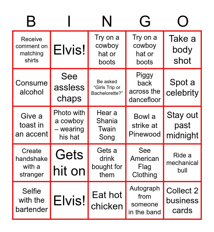 ⚠ This card has duplicate items: Hear a Shania Twain Song (2), Spot a celebrity (2), Eat hot chicken (2), Gets hit on (2), Buy a souvenir (2), Elvis! (2), Line dance (2), Consume alcohol (2), Stay out past midnight (2), Try on a cowboy hat or boots (2), Ride a mechanical bull (2), See American Flag Clothing (2), Chug a beer (2), Selfie with the bartender (2), Bowl a strike at Pinewood (2), Stranger buys you a drink (2), Take a body shot (2), Photo with a cowboy – wearing his hat (2), Receive comment on matching shirts (2), Give a toast in an accent (2)