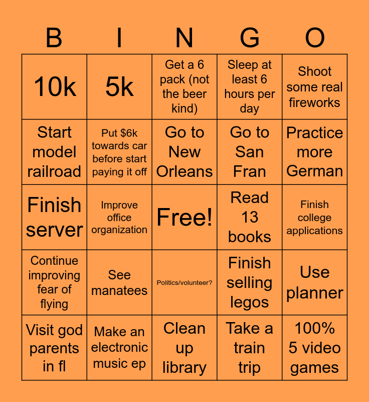 This bingo card has a free space and 24 words: Visit god parents in fl, See manatees, Go to New Orleans, Take a train trip, Shoot some real fireworks, 10k, 5k, Get a 6 pack (not the beer kind), Read 13 books, Finish college applications, Finish server, Put $6k towards car before start paying it off, Finish selling legos, Use planner, Start model railroad, Make an electronic music ep, Clean up library, Sleep at least 6 hours per day, Practice more German, Continue improving fear of flying, Improve office organization, Politics/volunteer?, Go to San Fran and 100% 5 video games.