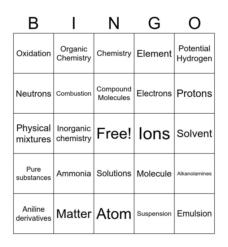 This bingo card has a free space and 24 words: Ammonia, Matter, Compound Molecules, Aniline derivatives, Potential Hydrogen, Oxidation, Neutrons, Organic Chemistry, Ions, Solutions, Electrons, Physical mixtures, Molecule, Alkanolamines, Combustion, Suspension, Solvent, Chemistry, Protons, Inorganic chemistry, Emulsion, Pure substances, Element and Atom.