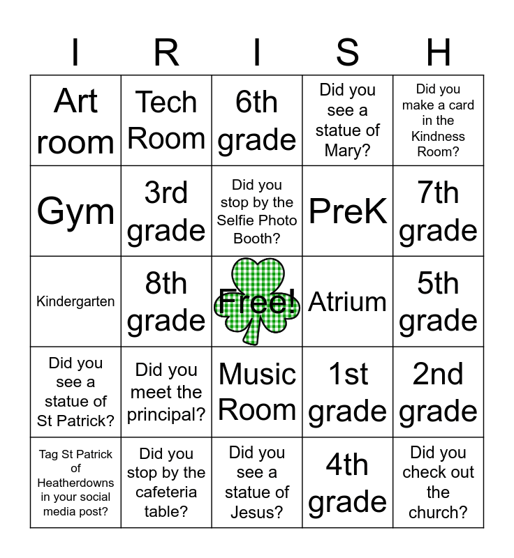 This bingo card has a free space and 24 words: Did you meet the principal?, Did you stop by the cafeteria table?, Did you stop by the Selfie Photo Booth?, Tag St Patrick of Heatherdowns in your social media post?, Did you make a card in the Kindness Room?, Art room, Gym, Tech Room, Atrium, Music Room, PreK, Kindergarten, 1st grade, 2nd grade, 3rd grade, 4th grade, 5th grade, 6th grade, 7th grade, 8th grade, Did you check out the church?, Did you see a statue of St Patrick?, Did you see a statue of Mary? and Did you see a statue of Jesus?.