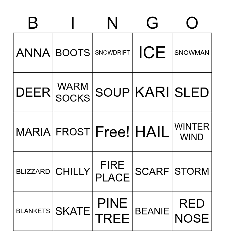 This bingo card has a free space and 39 words: OWL, MITTENS, HOT COCOA, WARM SOCKS, BLANKETS, FIRE PLACE, SOUP, TEA, SNOWMAN, BLIZZARD, FROST, ICE, RED NOSE, WINTER WIND, HAIL, CHILLY, FREEZE, ANNA, MARSH MALLOWS, SCARF, DEER, PINE TREE, KARI, SLED, SNOW FLAKES, PENGUIN, POLAR BEAR, NORTH POLE, ICICLE, BOOTS, CABIN, CARDINAL, SNOWDRIFT, SKATE, BEANIE, EMILY, STORM, MARIA and EVER GREEN.