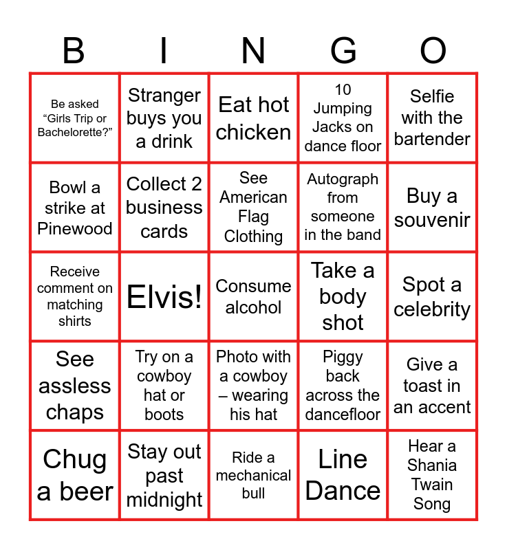 This bingo card has 25 words: Try on a cowboy hat or boots, Ride a mechanical bull, See American Flag Clothing, Chug a beer, Selfie with the bartender, Be asked “Girls Trip or Bachelorette?”, Bowl a strike at Pinewood, Stranger buys you a drink, Take a body shot, Photo with a cowboy – wearing his hat, Autograph from someone in the band, Receive comment on matching shirts, Piggy back across the dancefloor, Give a toast in an accent, Collect 2 business cards, Hear a Shania Twain Song, Spot a celebrity, Eat hot chicken, Buy a souvenir, Elvis!, Consume alcohol, Stay out past midnight, See assless chaps, 10 Jumping Jacks on dance floor and Line Dance.