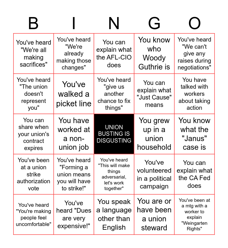 This bingo card has a free space and 24 words: You've heard "Forming a union means you will have to strike!", You've heard "Dues are very expensive!", You've heard "give us another chance to fix things", You've heard "You're making people feel uncomfortable", You've heard "We can't give any raises during negotiations", You've heard "We're all making sacrifices", You've heard "The union doesn't represent you", You've heard "We're already making those changes", You grew up in a union household, You've heard "This will make things adversarial, let's work together", You can explain what "Just Cause" means, You can share when your union's contract expires, You've volunteered in a political campaign, You can explain what the CA Fed does, You've walked a picket line, You are or have been a union steward, You know what the "Janus" case is, You can explain what the AFL-CIO does, You have talked with workers about taking action, You have worked at a non-union job, You've been at a mtg with a worker to explain "Weingarten Rights", You've been at a union strike authorization vote, You know who Woody Guthrie is and You speak a language other than English.