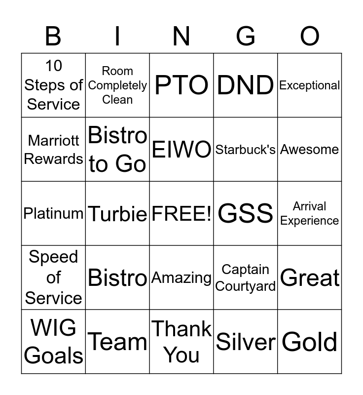 This bingo card has a free space and 24 words: Bistro, Team, EIWO, WIG Goals, Exceptional, 10 Steps of Service, Marriott Rewards, Room Completely Clean, GSS, Amazing, Starbuck's, Platinum, Captain Courtyard, Great, Bistro to Go, Silver, Arrival Experience, PTO, Awesome, Turbie, Gold, Speed of Service, DND and Thank You.