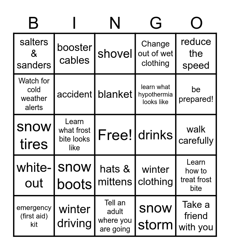 This bingo card has a free space and 34 words: icy road, snow storm, slippery, blizzard, white-out, accident, reduce the speed, emergency (first aid) kit, booster cables, flashlight, blanket, shovel, CAA, snacks, drinks, be prepared!, winter driving, snow tires, snow boots, winter clothing, hats & mittens, coats, salters & sanders, walk carefully, Tell an adult where you are going, Take a friend with you, Change out of wet clothing, Have extra mitts, hat and socks handy, learn what hypothermia looks like, Watch for cold weather alerts, walk like a penguin, Learn what frost bite looks like, Learn how to treat frost bite and Learn how to treat hypothermia.