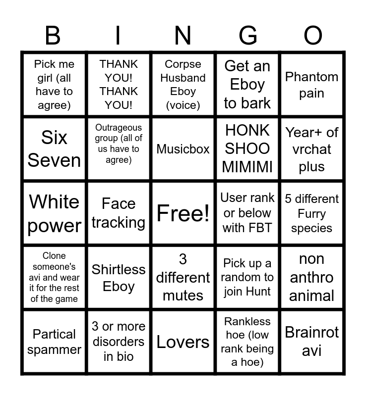This bingo card has a free space and 24 words: Shirtless Eboy, 3 or more disorders in bio, Musicbox, Partical spammer, Phantom pain, Pick me girl (all have to agree), Six Seven, THANK YOU! THANK YOU!, User rank or below with FBT, 3 different mutes, HONK SHOO MIMIMI, White power, Pick up a random to join Hunt, non anthro animal, Outrageous group (all of us have to agree), Rankless hoe (low rank being a hoe), 5 different Furry species, Corpse Husband Eboy (voice), Year+ of vrchat plus, Face tracking, Brainrot avi, Clone someone's avi and wear it for the rest of the game, Get an Eboy to bark and Lovers.